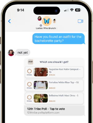 Getting input from friends is a critical part of the purchase journey for online retail. With 12th Tribe, we turned this existing behavior into a word of mouth growth engine. With a single tap, shoppers can turn their cart into a poll and share into their group chat on iMessage or WhatsApp.