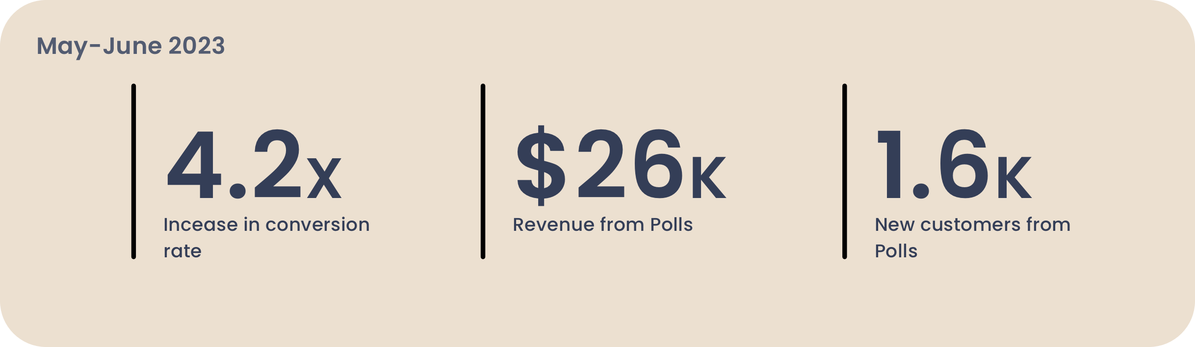 With 12th Tribe, we measured the conversion rate of the new users that came in from Polls and saw a 4.2x increase in conversion rate compared to the average visitor, and a massive increase in AOV as well.