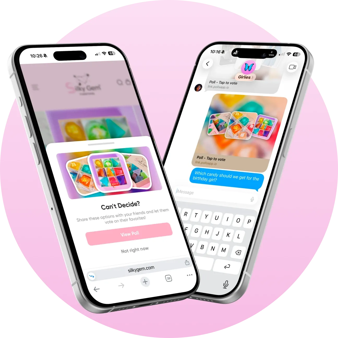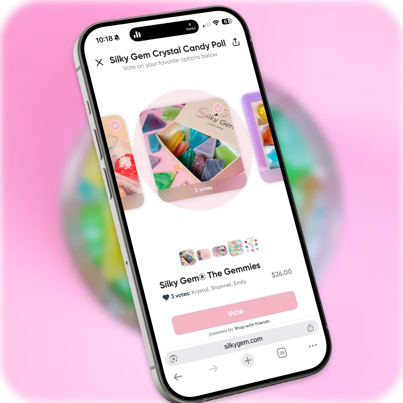 Enter Shop with Friends, a social shopping app that lets customers create and share interactive polls with friends via group chat. The tool embedded seamlessly into Silky Gem’s Shopify store; setup took less than 5 minutes and required no intrusive banners. Now when someone is browsing, they can send a poll asking “Which one should I get?” to a group of friends. Friends vote directly from their phones and can buy their chosen flavor right from the poll, turning group chats into a storefront.